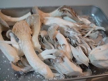 5、残りの半量のきのこをボウルに入れ、aを加えて全体にまぶす(写真右)。