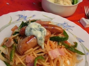 ケチャップをメインにした味付けの懐かしのナポリタンです。その上に、長いソーセージをド~ンとのせて、男子ごはんならでは!