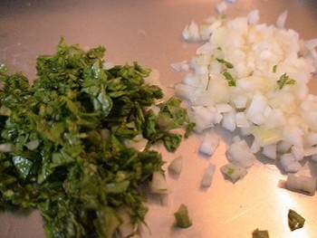 1.セロリの茎はピーラーで皮をむいて粗みじん切りにする。葉(数枚)もみじん切りにする(写真右)。赤唐辛子はヘタと種を取り除いて粗みじん切りする。