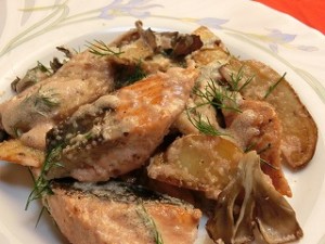 7、皿に盛り、【鮭とジャガイモの明太クリームソース】 の出来上がり。