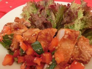 4、3の鶏肉を食べやすい大きさに切って器に盛り、1のトマトソースをかけて【鶏のから揚げフレッシュトマトソース】 の出来上がり。