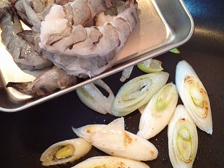 焼き目がついたらえびを加えて、塩・黒こしょうをふり、にんにく、しょうがを加えて炒めます。