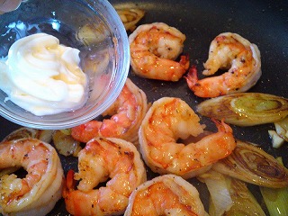 3.酒を加えてザッと炒め、火を止めて、マヨネーズ、砂糖を加えて絡めて【簡単えびマヨ】の出来上がり