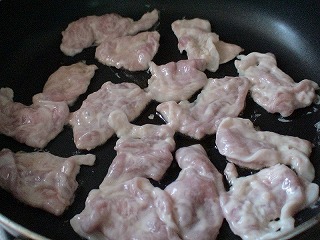4.フライパンにごま油(大さじ1)を入れて、2の豚肉を揚げ焼きします。