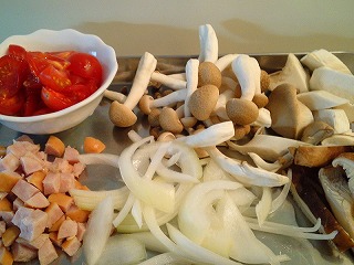1.ソースのタマネギは薄切り、ソーセージは縦4等分し小口切り、きのこ類は食べやすい大きさに切ります。