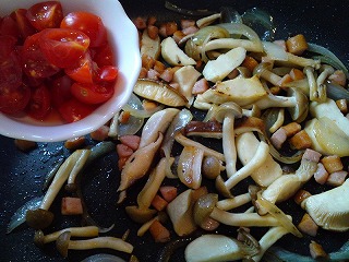 トマトは、ミニトマトを使ってもOK!その場合は湯むきは不要!と楽なので、ミニトマトを使用しました。ほどよい酸味がとってもよかったです!ケチャップが少なめでもキノコの風味やトマトの酸味が活きるかも。