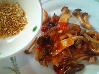 8.7をお皿に盛りつけ、煎ったパン粉、イタリアンパセリをトッピングします。