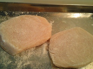5.メカジキに塩をふり、小麦粉をまぶします。