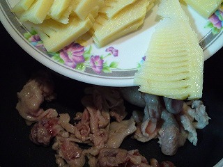 1.たけのこ(200g)は薄切りに、豚肉(200g)は大きければ切ります。