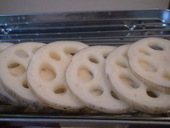 1.れんこんは皮ごとよく洗い、5mm厚さの輪切りにし、24枚用意する。