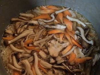 6.炊飯器に米、4の切った野菜、キノコ、5の合わせただし汁を入れ炊く