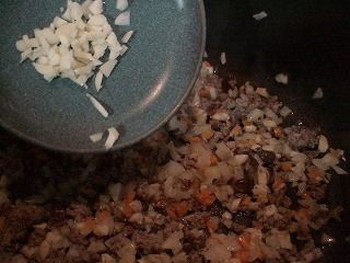3.玉ネギ・ニンジン・ピーマン・セロリ・シイタケを加えて鍋底を洗うように炒め、最後にニンニクを加えて香りが出るよう炒め、鍋底にはりついたものは、火を止めフタをしてしばらく蒸らしてからこそぐ。