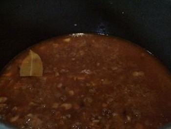 6.ブイヨン・ローリエを加えて中火で煮る。アクを取りながら、中火で40~50分煮込む。(具が煮とけるくらい・具材が顔を出すくらいまで)