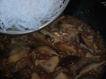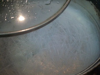 (写真右:鍋に湯をわかし、火を消して、春雨を入れて蓋をしてみました)
