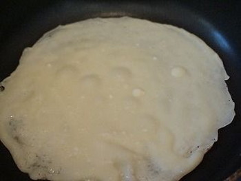 フライパンを熱し、サラダ油を薄く敷き、1の生地を薄く流し入れ(写真右)、焼き色がついたら裏返して、さっと焼いて取り出す。