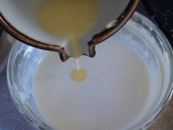 1.ボウルに卵を溶きほぐし、牛乳、ヨーグルトを加えて混ぜ合わせ、ホットケーキミックスを混ぜ合わせて、20分ほどねかせて、溶かしバターを加える。
