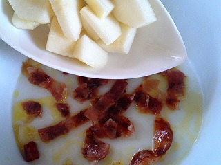 どんな味なの???と興味津津で、早速、お昼に作ってみました。茶色に変色(追熟)し、手で触ってやわらかい洋ナシを野菜ソムリエのロンブー淳さんがおすすめしていましたが、手に入りませんでした(-“-)。