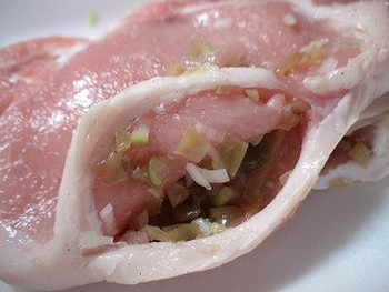 1.豚肉の脂身から包丁を入れて、袋状にする