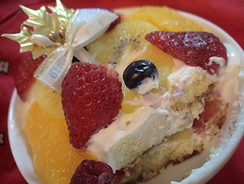 カステラは、 【イチゴのケーキ】 を作った時、山に膨らんだカット部分を使いました。私はラム酒を多めにし、カステラしっとりで美味しかったです~(⌒~⌒) 写真右:断面の感じです