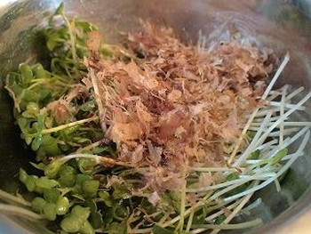 4.3に食べやすい大きさに切った水菜を加えます。