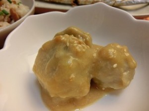 4、器に盛り、白ごま(適量)をふって【里芋のチーズみそ煮っころがし】 の出来上がり。