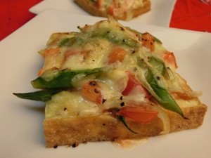 2の野菜をのせ、塩・こしょう(各少々)をふり、ピザ用チーズ(60g)を散らす。オーブントースターで8~10分間、チーズが溶けるまで焼きます。