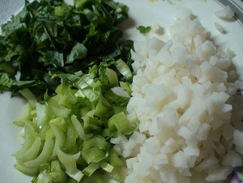●れんこんの皮をむき、5mm角に切る。小松菜の茎を5mmほどに切り、葉はみじん切りにして分けておく