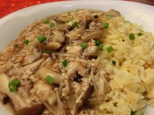 7、4のパラパラチャーハンの上に、6のあんをかけて、【キノコたっぷり あんかけチャーハン】の出来上がり。