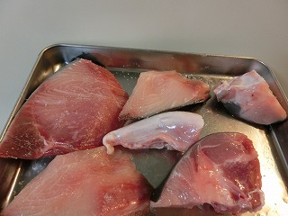 3、1のブリから水分が出てきたら、ペーパーでよくふき取り、一口大よりやや大きめに切ります。