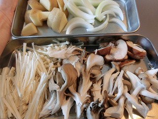 1、ジャガイモ(1個)は一口大に(放送:皮つきのまま)、タマネギ(1/4個)は薄切りにします。 シイタケ(2個)、エノキダケ(1袋)、マイタケ(80g)は、石づきを取り除き食べやすい大きさにそれぞれ用意します。