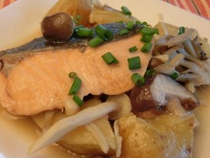 6、全体にいきわたるようにして【サケとキノコの蒸し焼き】 出来上がり。