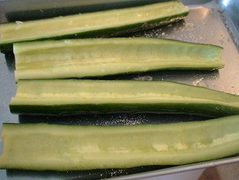 2.1のキュウリの両面を塩(適量)で揉み、5~10分置く。しんなりしてきたら水で洗い、ペーパーなどで 水気をふき取る。