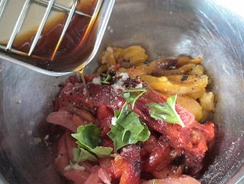 5.ボウルに切ったトマト、パプリカ、ちぎったバジルを入れ、塩、コショウ、ニンニク、ワインビネガー、 ハチミツを入れて混ぜ合わせる。