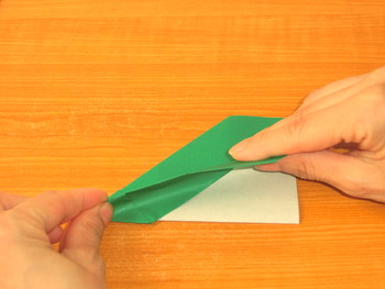 1、折り筋をつけてから、左角を三角に折ります。
