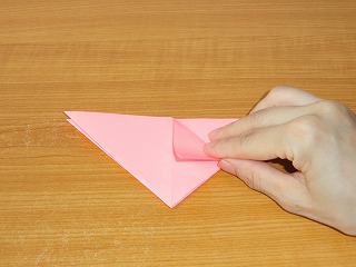 10、ここから15までは手前右の三角だけを折っていきます。まず、折り筋をつけます。