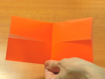 1、半分におってもどし、おりすじをつけます。