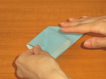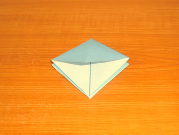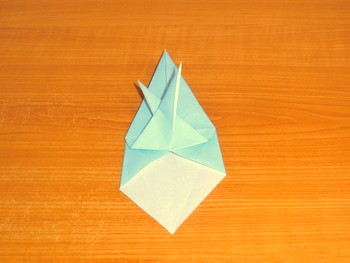 9、裏返したら、下の先を少し斜めにそれぞれ折り上げます。