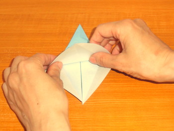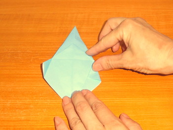 6、手前の角を折り上げます。ここまで「鶴(つる)」の折り方と同じです。