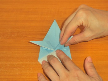 8、手前の1枚を7でつけたところで、開きながら上から折り下げます。