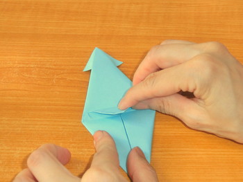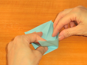 6、指を入れて上の角を折り下げながら、開いてつぶします。