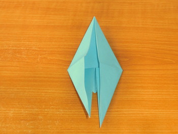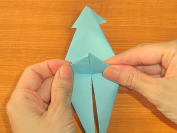 11、三角のとろこを折り下げます。もう一度下に折ります。