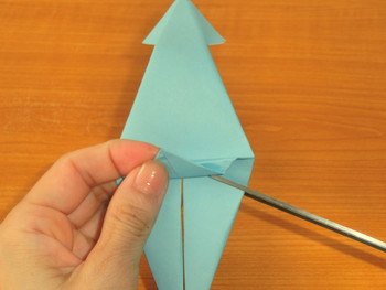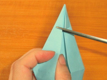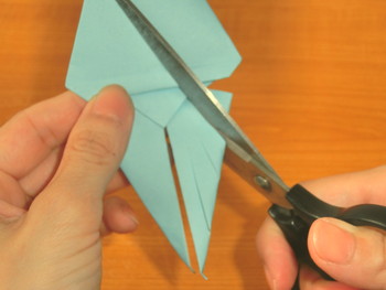 12、両側に切りこみを入れたら、切った部分を向こう側に折ります。