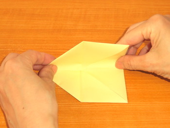 1、折り筋をつけてから、4つの角を真ん中に向けて折ります。
