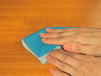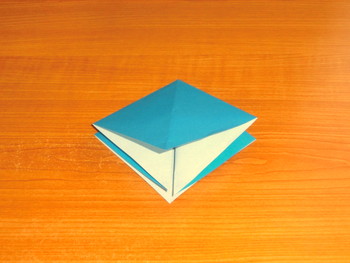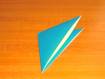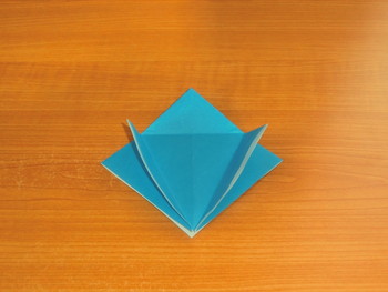 6、手前の角を折り上げます。裏も同じ。ここまで「鶴(つる)」と同じ折り方です。