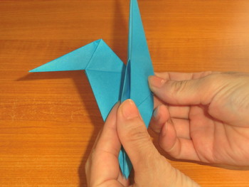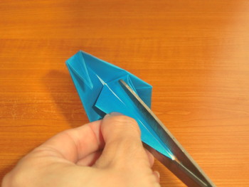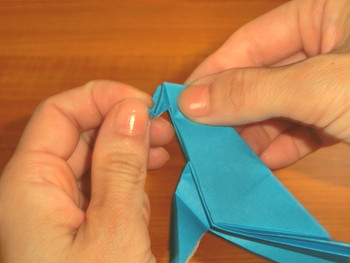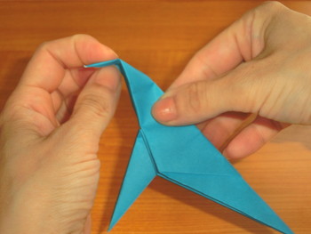 9、向きを変えたら、上の先を中割折りにして頭を折ります。