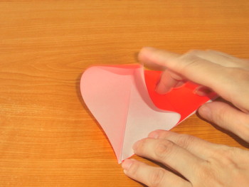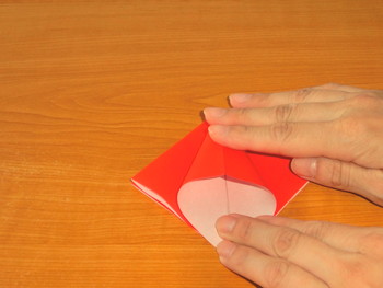 5、上の1枚に指を入れて袋を開き、図のように折ります。