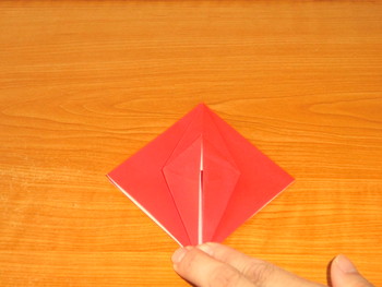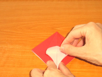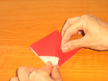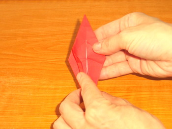 9、左右の細い三角を山折りにします。他の3か所も同じ。