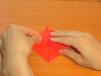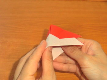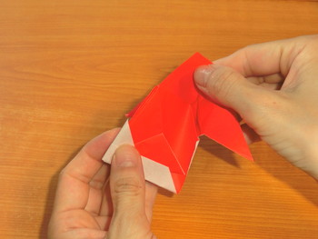 7、下の三角を向こうがわにおり上げて、兜(かぶと)の出来上がり。