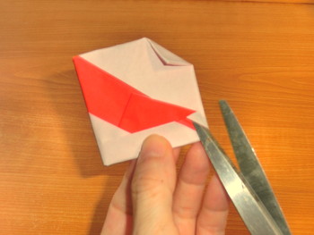 9、向きを変え 右の角を小さく三角に折って折り筋をつけたら、下からハサミを入れて切ります。裏も同じようにり切ります。